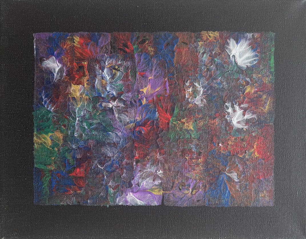 - Hauptmedien: Acryl auf Leinwand, ergänzt durch Kreide, um Struktur und zarte Konturen zu schaffen