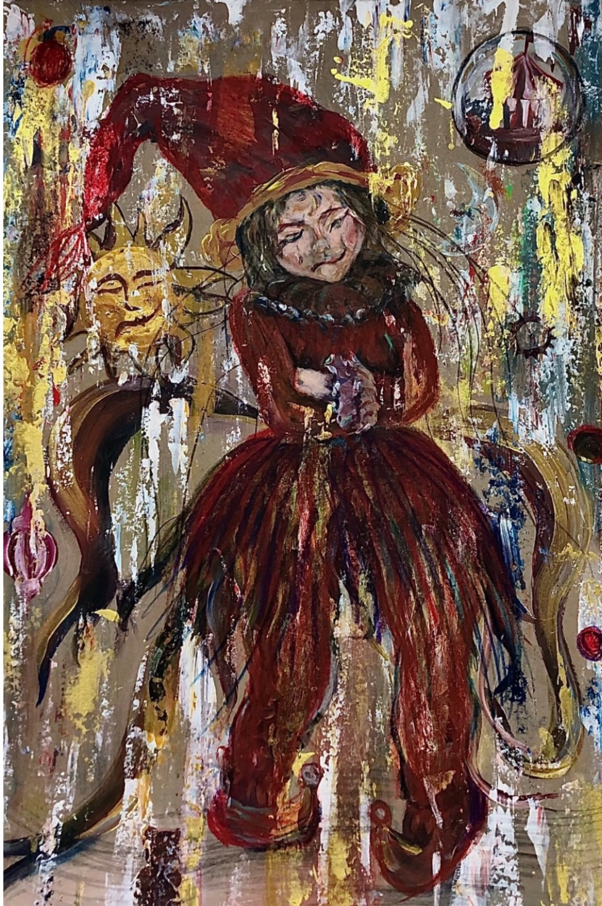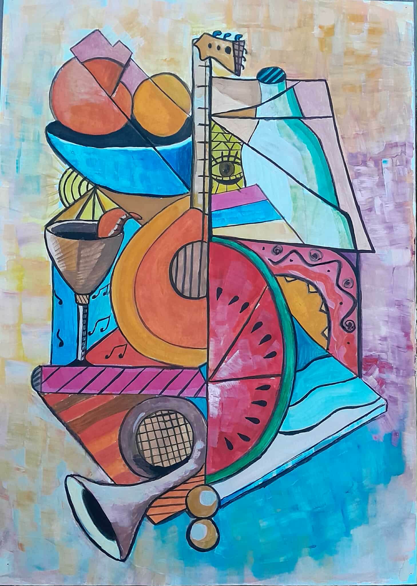 50/70, ზეთი/ტილო, კომპოზიცია აგებულია ფორმებისა და ფერების რიტმულ თანხვედრაზე, სადაც მუსიკალური ინსტრუმენტები, ხილი და აბსტრაქტული ელემენტები ერთიან ვიზუალურ ჰარმონიად იკვრება. გაყოფილი სივრცე და მკვეთრი კონტურები ქმნის დინამიურ მოძრაობას, ხოლო ნათელი ფერთა პალიტრა სიცოცხლის, ხმაურისა და ემოციური ენერგიის განცდას გადმოცემს. ნამუშევარი ასახავს მუსიკის, ფორმისა და ფერის ურთიერთქმედებას.