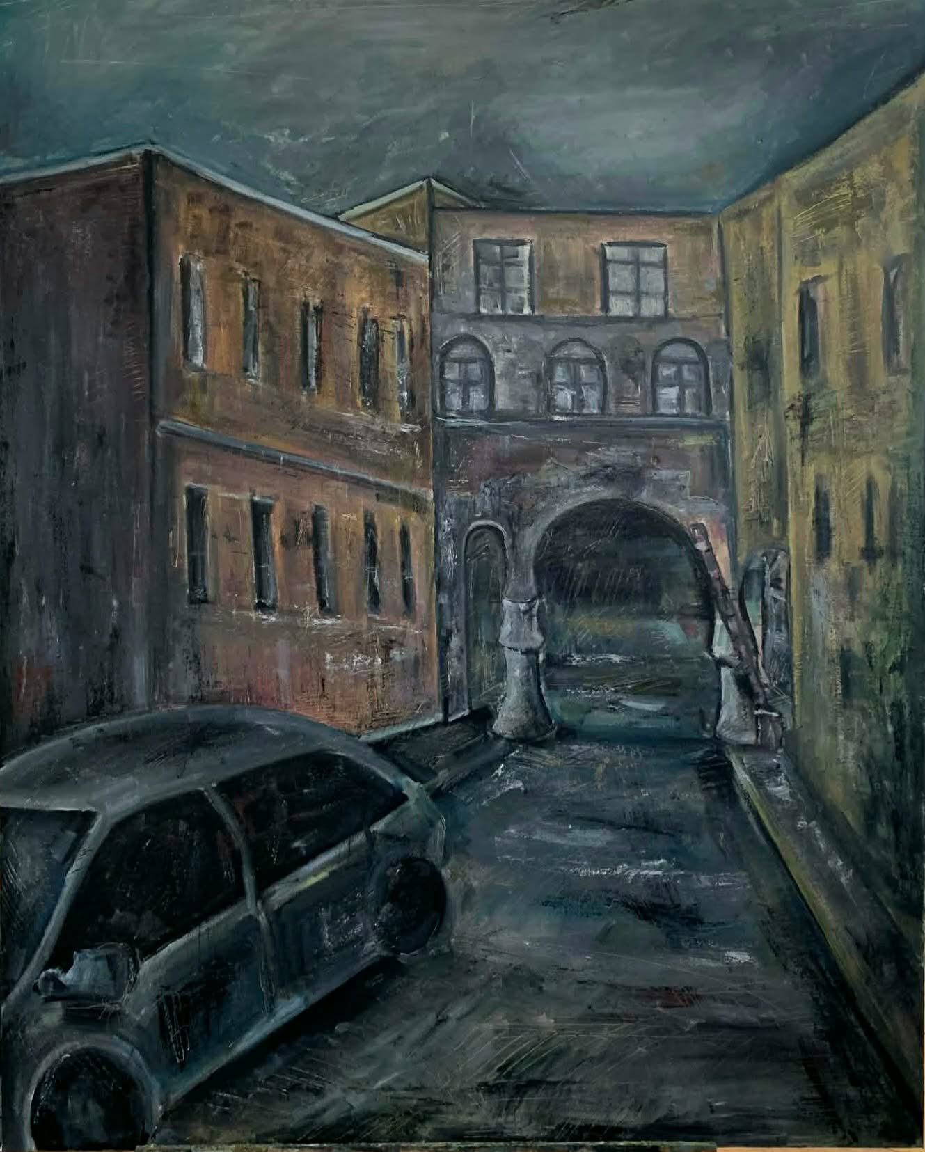 100*80, ზეთი/ტილო, ნამუშევარში ასახულია ურბანული სივრცე მძიმე და ჩაბნელებულ ატმოსფეროში. არქიტექტურა და ცარიელი ქუჩა ქმნის ნოსტალგიურ განცდას. ფერთა პალიტრა და უხეში ტექსტურა უსვამს ხაზს ქალაქის ემოციურ სიმძიმეს და ადამიანის უხილავ ყოფნას სივრცეში.
