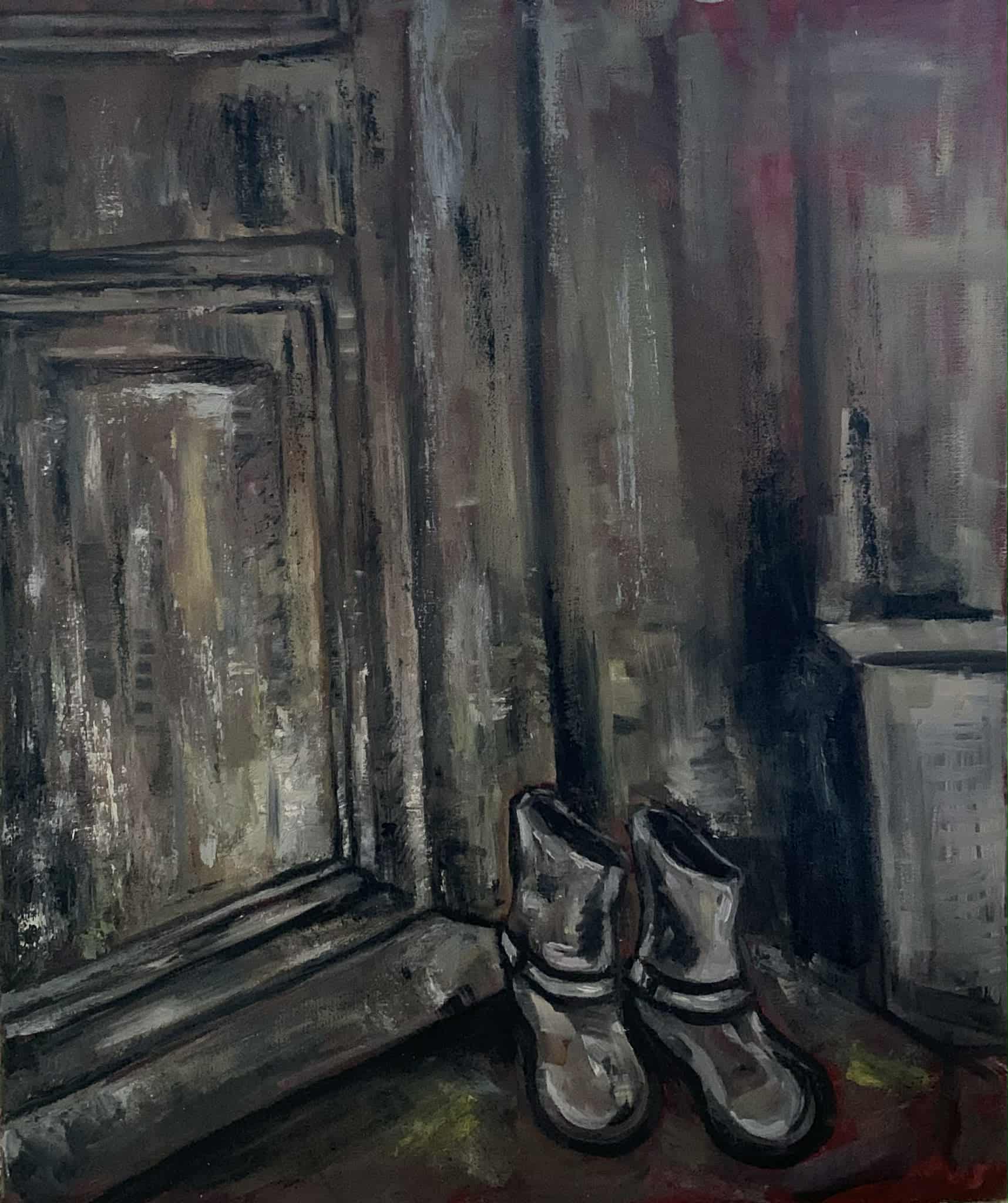 პირველი ნამუშევარი. ,,დარჩენილი ჩექმები” ზეთი/ტილო, 50*70, ინტერიერის ფრაგმენტი, სადაც ყოველდღიური ობიექტი — ჩექმები — სიმბოლურ დატვირთვას იძენს. გაცვეთილი ზედაპირები და მკვეთრი ფაქტურა დროის კვალს და გაჩერებული მომენტის განცდას გამოხატავს. ნამუშევარი პირად განცდებსა და შინაგან მდგომარეობაზე მეტყველებს.