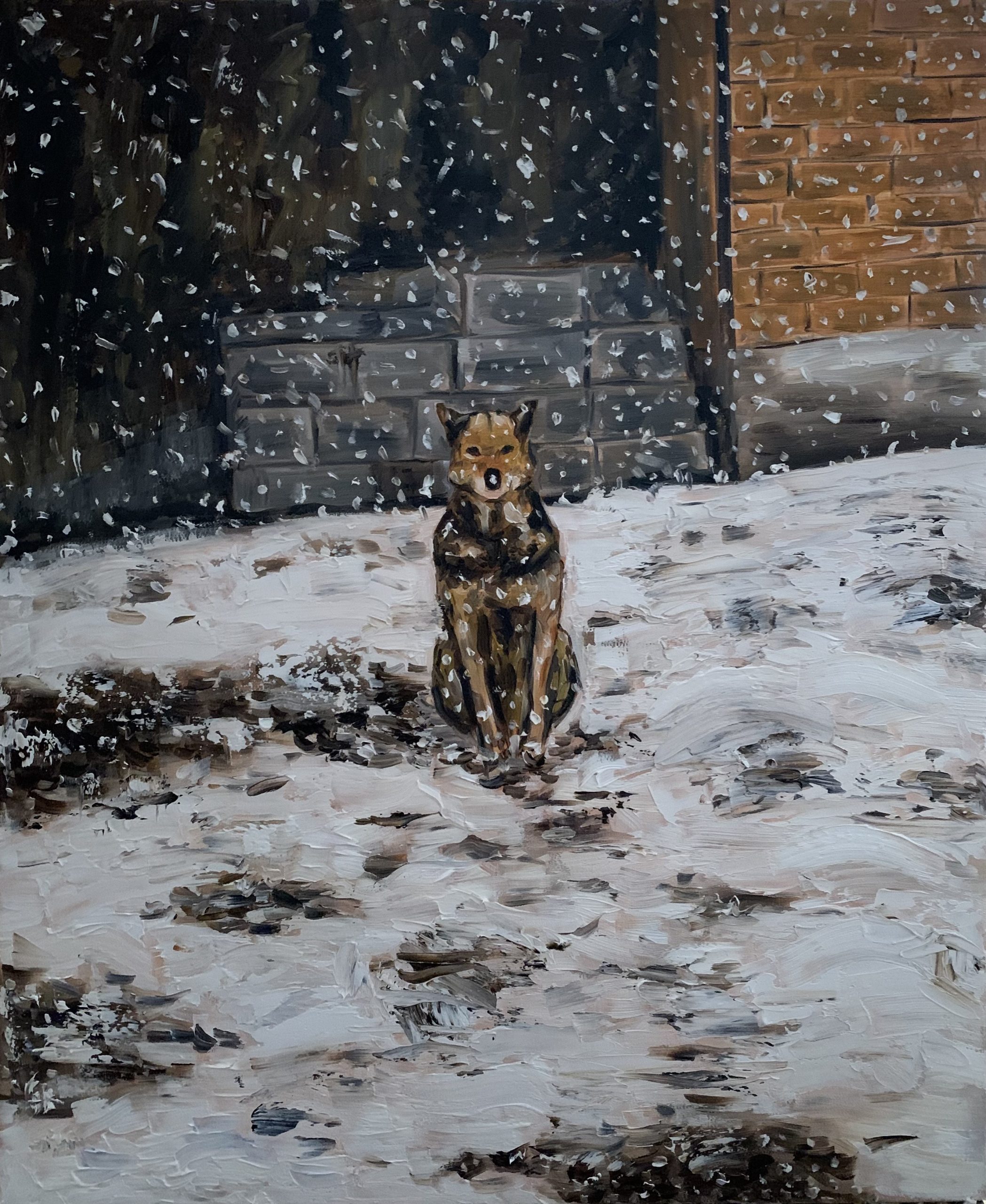 პირველი ნამუშევარი: ,, თოვლში “, ტილო ზეთი , ზომა 50/60სმ , წელი 2025.